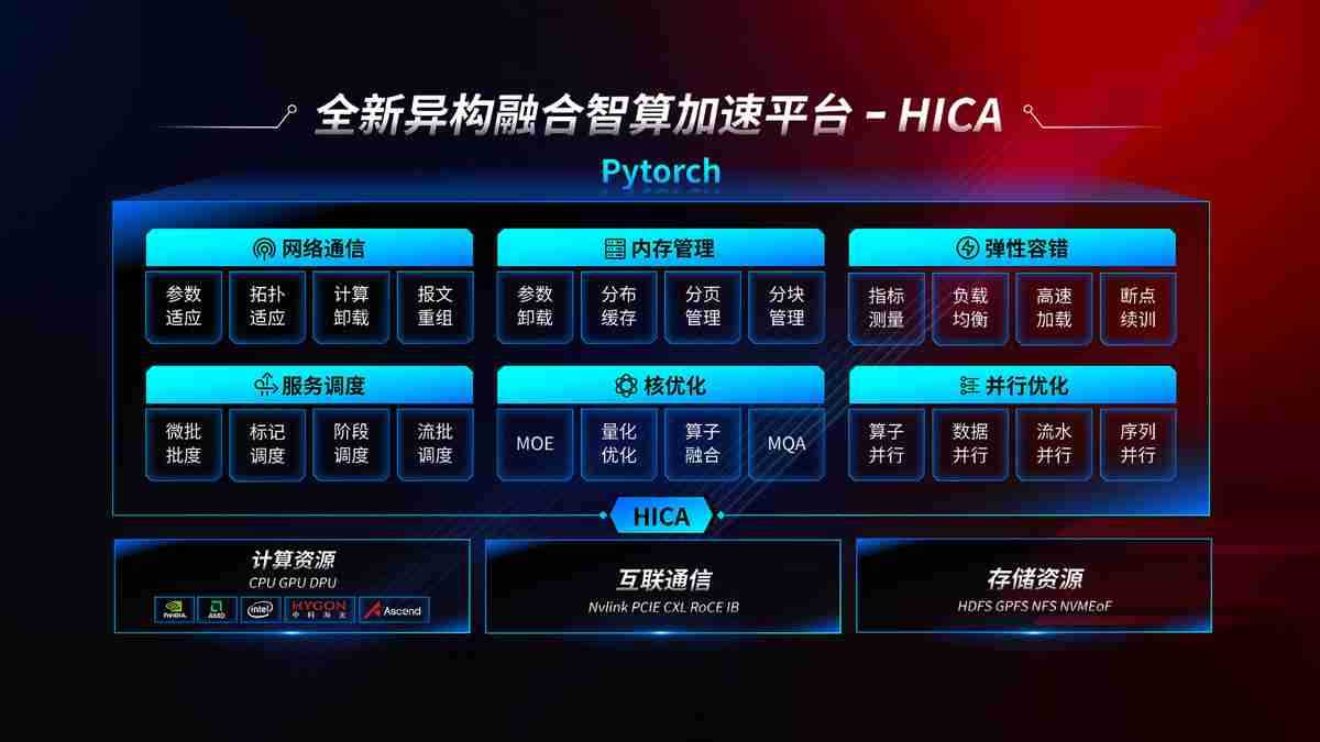 通过自研的服务层、、中间适配层、、、、以及调度编排算法,,,采用数据并行、、模型并行等多种并行方式,,把并行计算任务进行有效的分解,,,使其分别由相应的软件栈和算力资源来承接。。。。当GPU资源变化,,,HICA可以实时动态调度计算子任务并调整模型拓扑和架构,,,以充分聚合各种算力资源。。。。