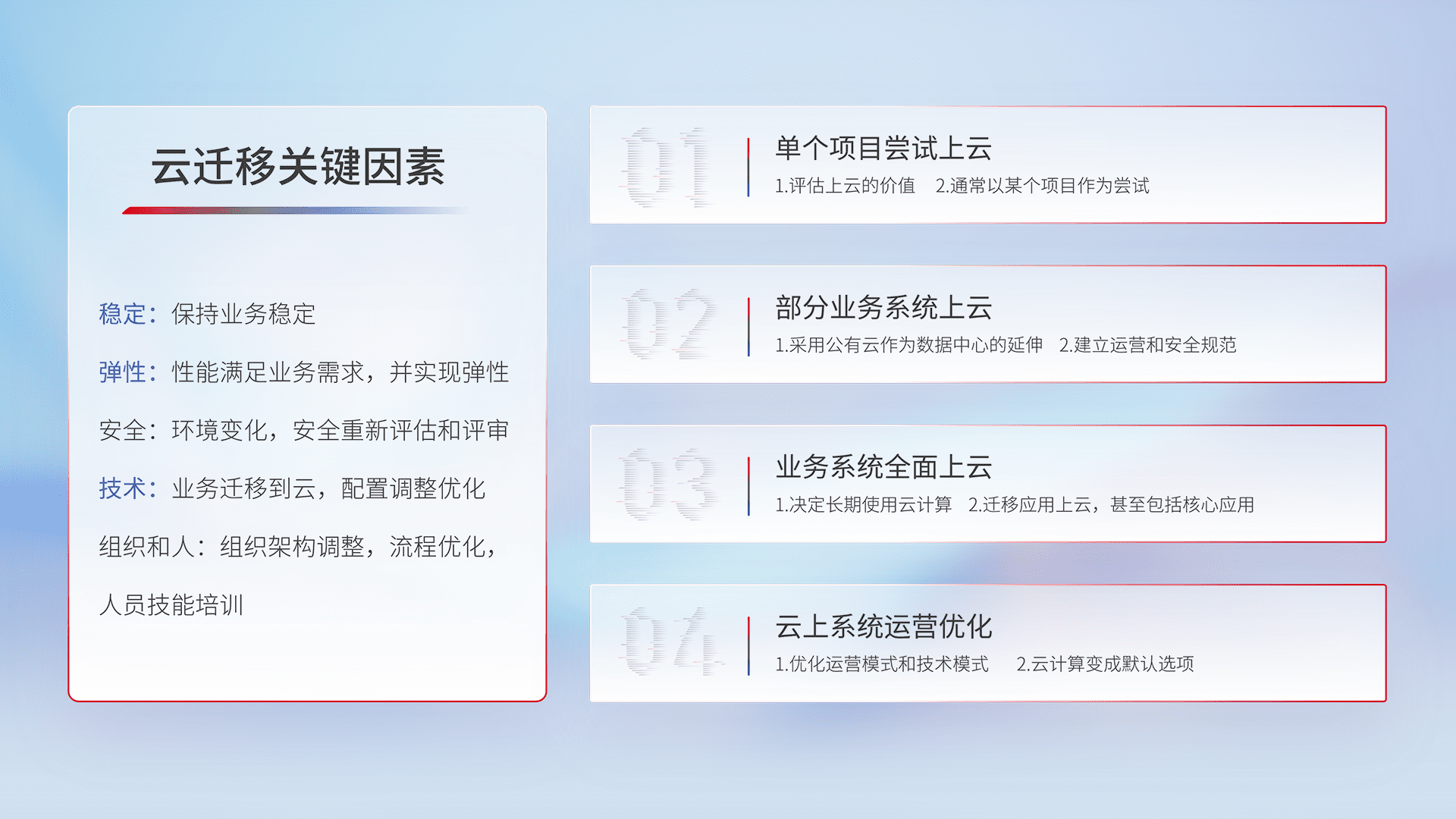 结合实际业务,,,,从规划设计、、、、云平台选型、、、云原生改造、、数据迁移、、集成交付,,,,迁移全过程为客户识别最佳上云路径,,,,做好风险识别管理,,,设计网络架构、、、身份权限、、、、安全审计合规、、、操作审计、、、、日志审计、、监控告警策略、、、、多站点容灾设计等,,,对云上基础设施进行整体规划,,,,提升IT治理水平,,,以满足弹性、、高可用、、高性能的需求。。。
