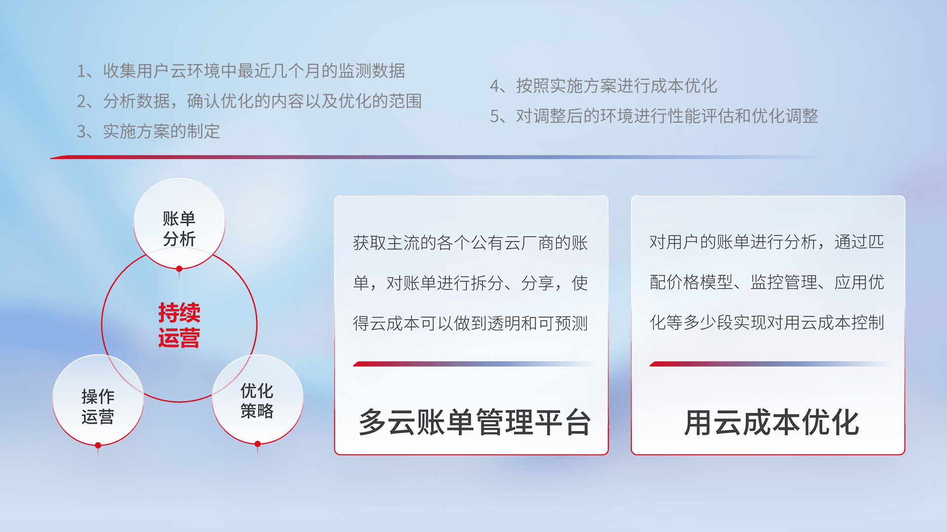 通过多云纳管,,以统一的资源数据模型把客户的云资源进行抽象和封装,,,,进而实现对多云资源的统一操作,,,,保障云资源管理的可靠性、、、、稳定性与可用性。。量身定制化运维内容,,,配置、、、开发运维、、补丁管理、、备份、、、、监控、、认证和访问管理、、、、审计和日常巡检等,,保障在用云过程中的可靠度,,稳定度以及高可用率。。。